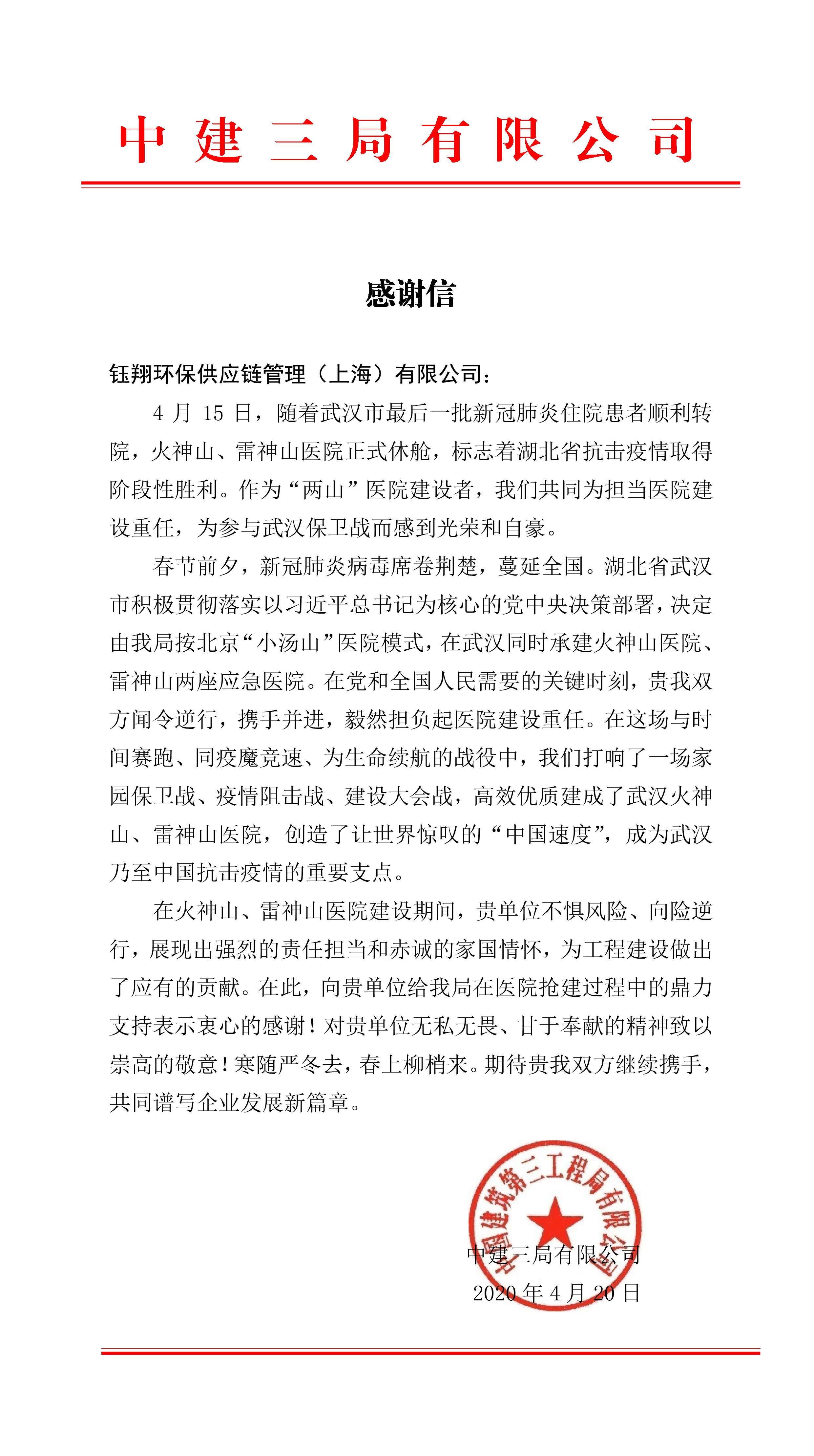 中建三局感謝信
